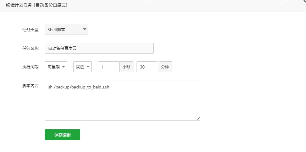 任务类型选择 Shell 脚本,自动备份百度云,执行周期看个人,脚本内容为