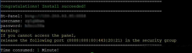 ①使用 ssh,登录服务器,命令行输入:yum install -y wget && wget -O install.sh http://download.bt.cn/install/install_6.0.sh && sh install.sh 等待安装成功,并记录宝塔面板的登录地址及密码。(期间会提示是否安装,输入 Y,回车)