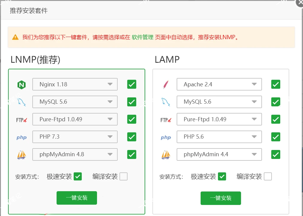 ③一键安装推荐套件:LNMP 网站环境是 Linux+Nginx+Mysql+PHP 的组合搭配网站程序环境,用来快速搭建各种开源的网站程序(WordPress,帝国 CMS,织梦,Zblog 等)