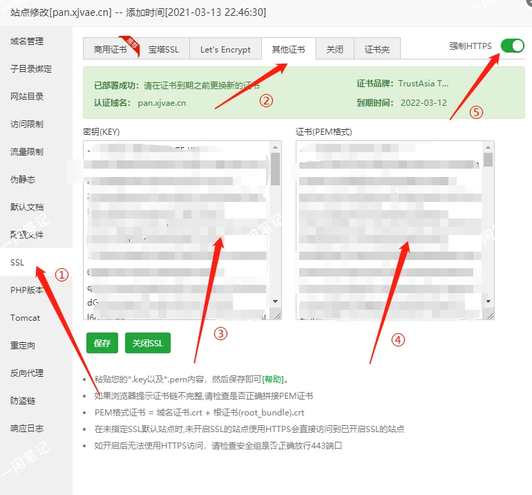 ④新建站点,强制开启 ssl:ssl 证书在购买.com/.cn 等**域名的时候会赠送个免费的 ssl,具体看服务商。如果没有,可以去腾讯云 dnspod 上免费申请。证书在 nginx 文件夹下。或是直接申请宝塔的 ssl。