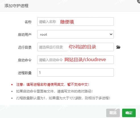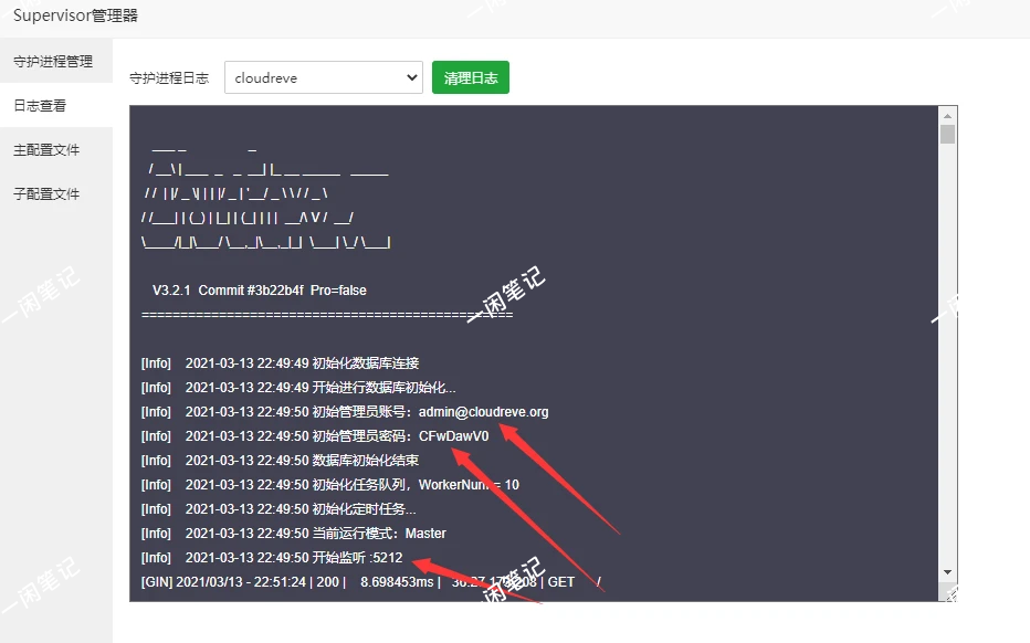 ⑤安装 cloudreve:进官网下载 http://cloudreve.org/,用宝塔面板上传到网站根目录并解压。进软件商店,安装 Supervisor 管理器 2.2。添加守护进程,如下图。启动进程,在日志查看里找到并记录 cloudreve 的管理员账号密码。在安全界面的防火墙里面,放行 5212 端口,并在自己的服务器端放行 5212 端口。测试你的服务器 http://服务器 IP:5212。