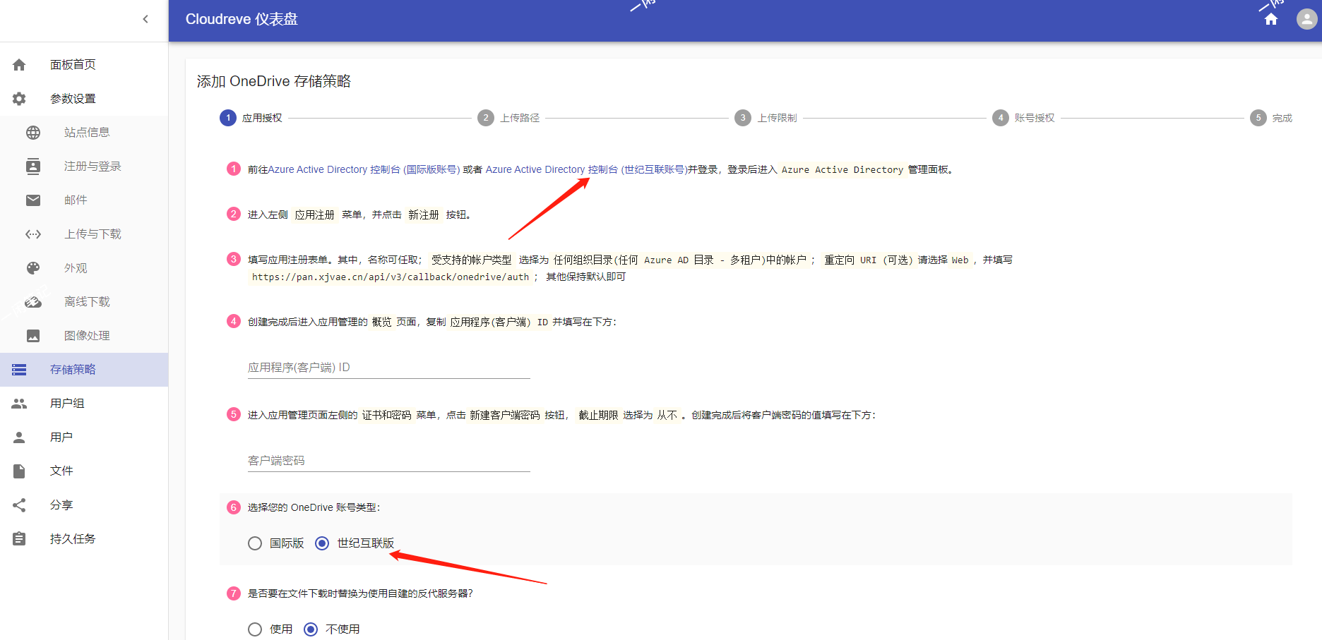 ④按照上面的提示操作,点击 Azure Active Directory 控制台 (世纪互联账号),选择 onedrive 账号类型为世纪互联。其他内容从 Azure Active Directory 后台获取填写,开发者写的很详细了,这里就不细说。后面的上传路径和上传限制可直接默认。