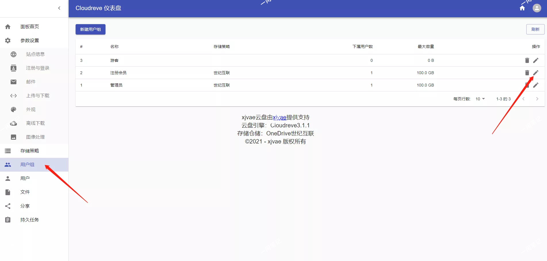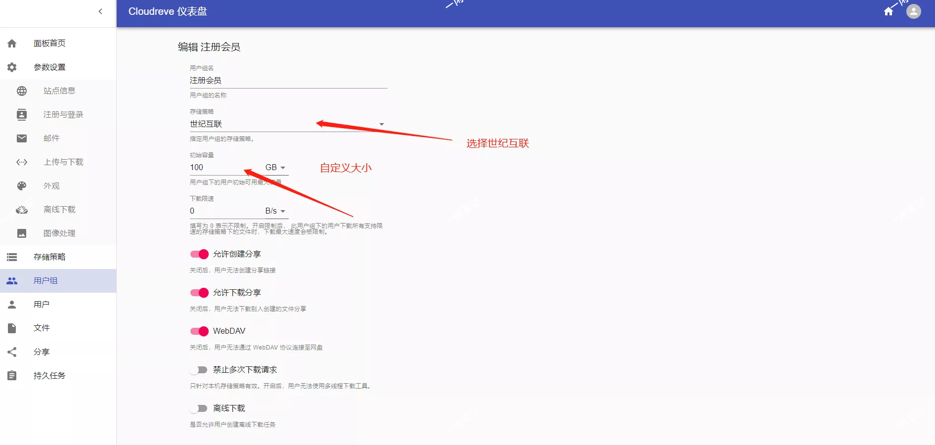 ⑤添加存储策略成功后,选择左侧用户组将所要用到的用户组编辑存储策略和容量大小。(世纪互联默认是 1TB,可自己调整大小)
