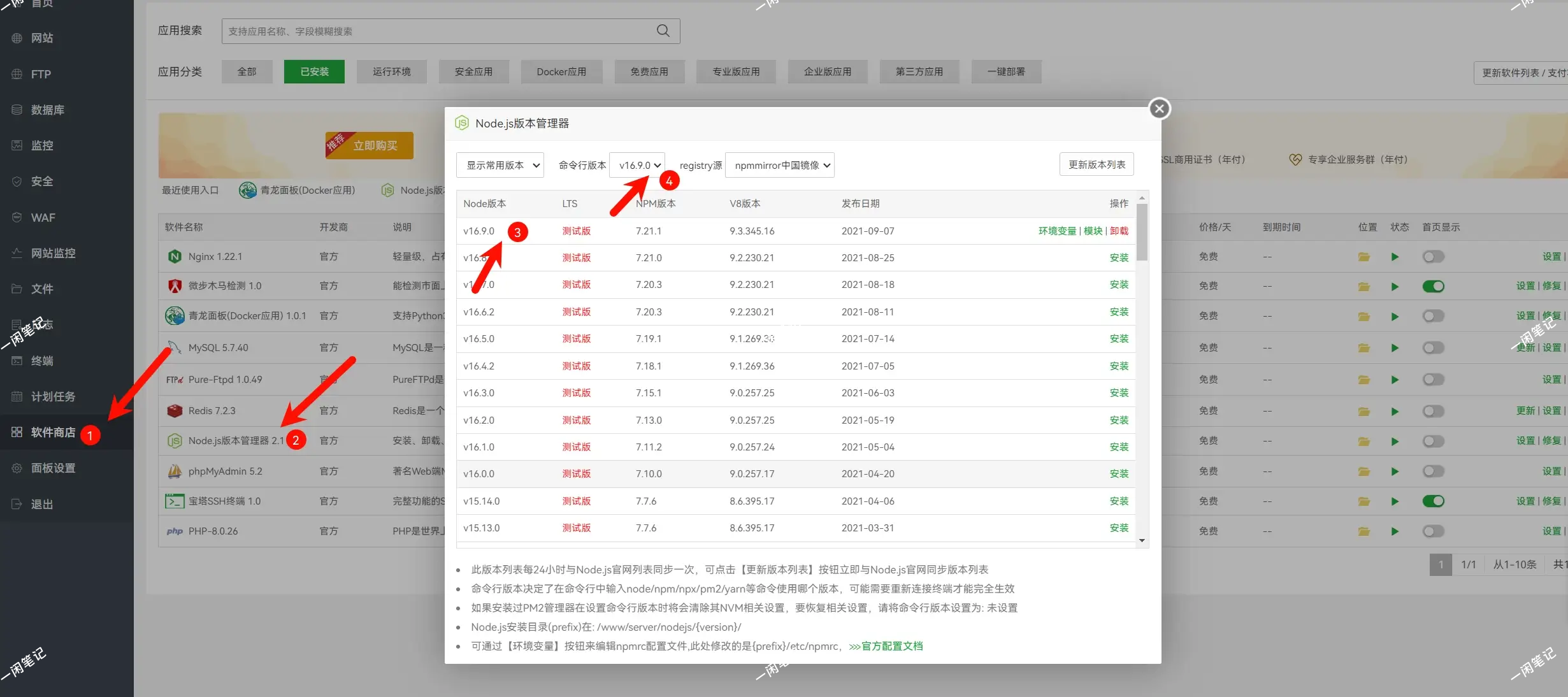 安装 Node.js 版本管理器:进入宝塔 -->软件商店 -->Node.js 版本管理器 2.1 -->设置 -->安装 v16.9.0 -->命令行版本选择 v16.9.0